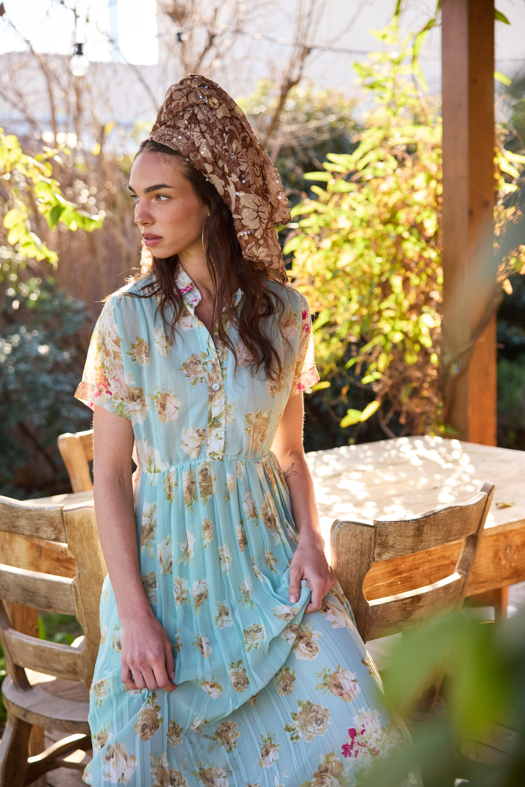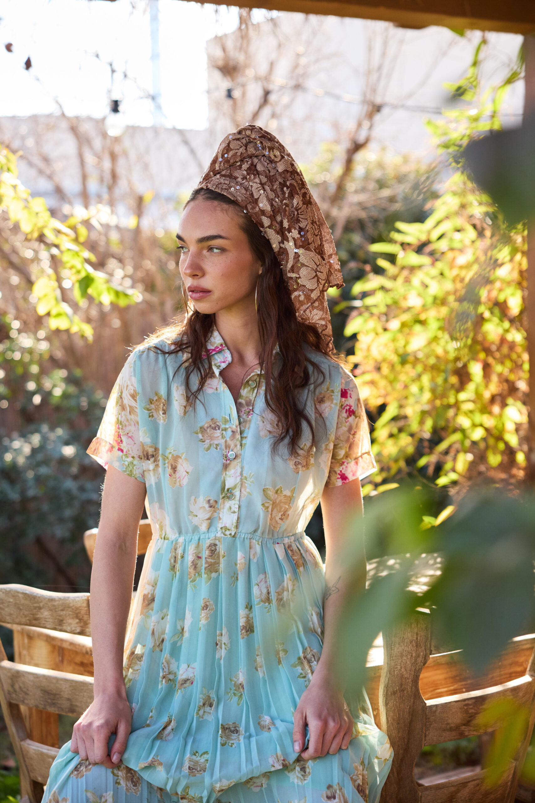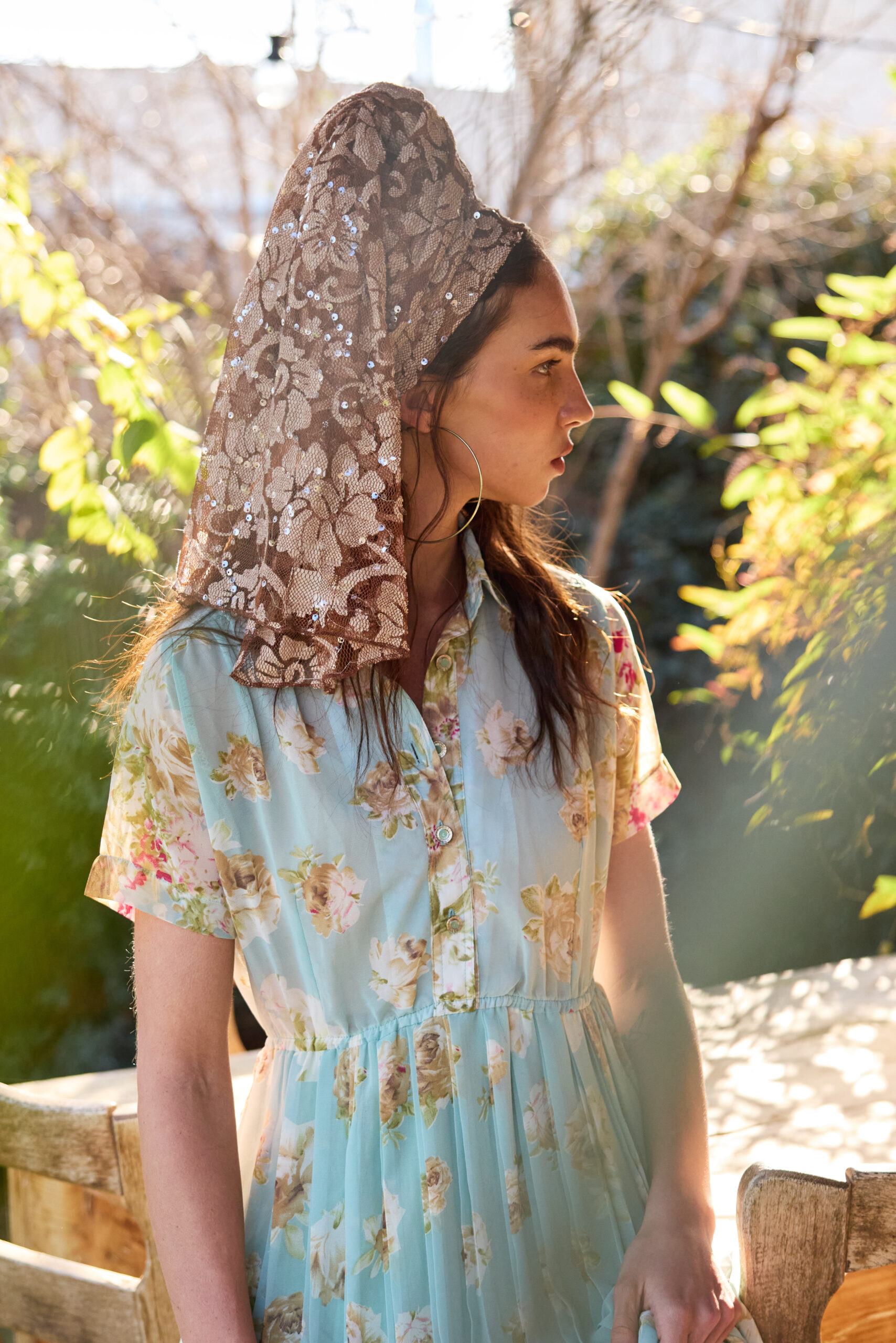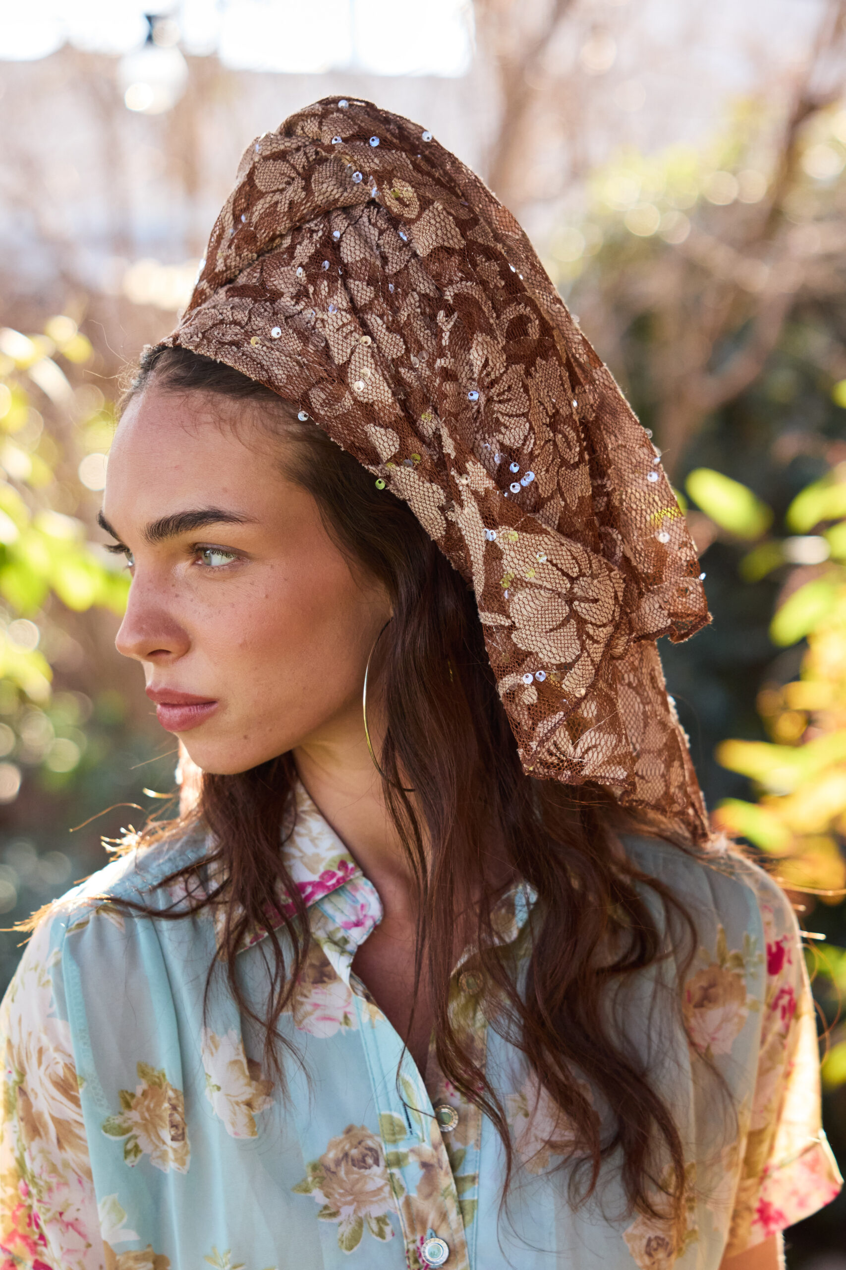 מטפחת תחרה עדינה בגוון חום בהיר טבעי עם רקמת פרחים עשירה ושיבוץ פייטים עדינים שמחזירים אור בנצנוץ רך.