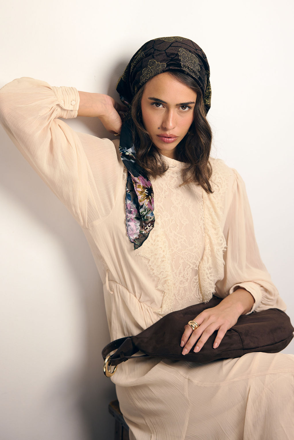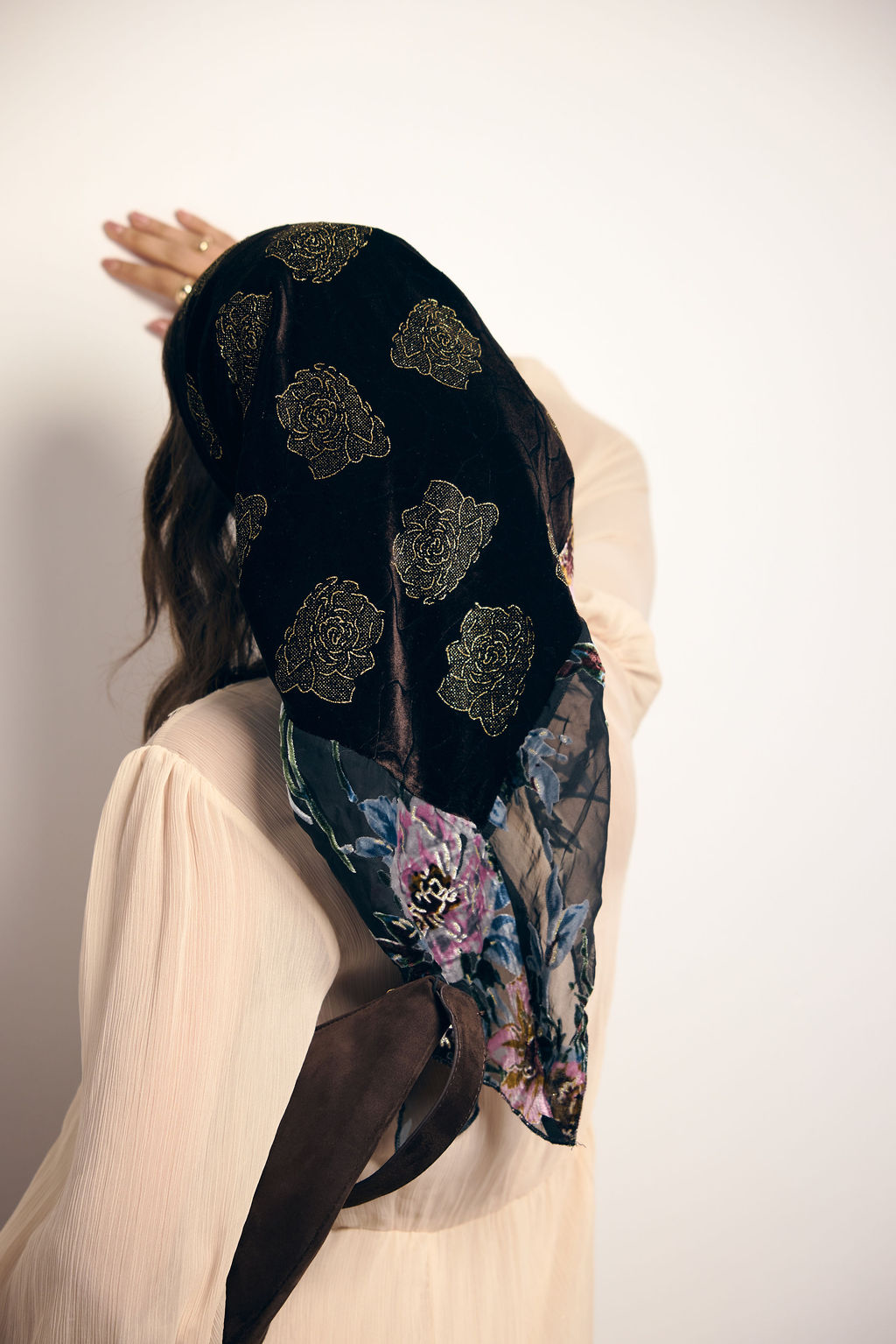 משולש קטיפה צרובה בגוון חום שוקלדי נדיר עם הדפסי פרחים בזהב,