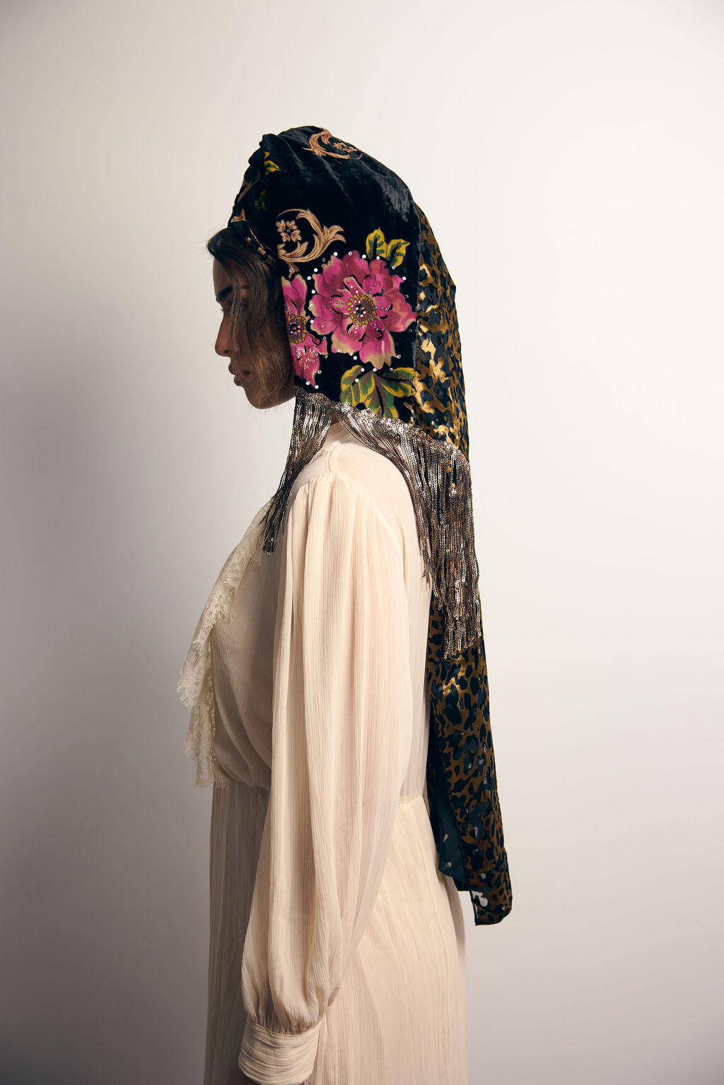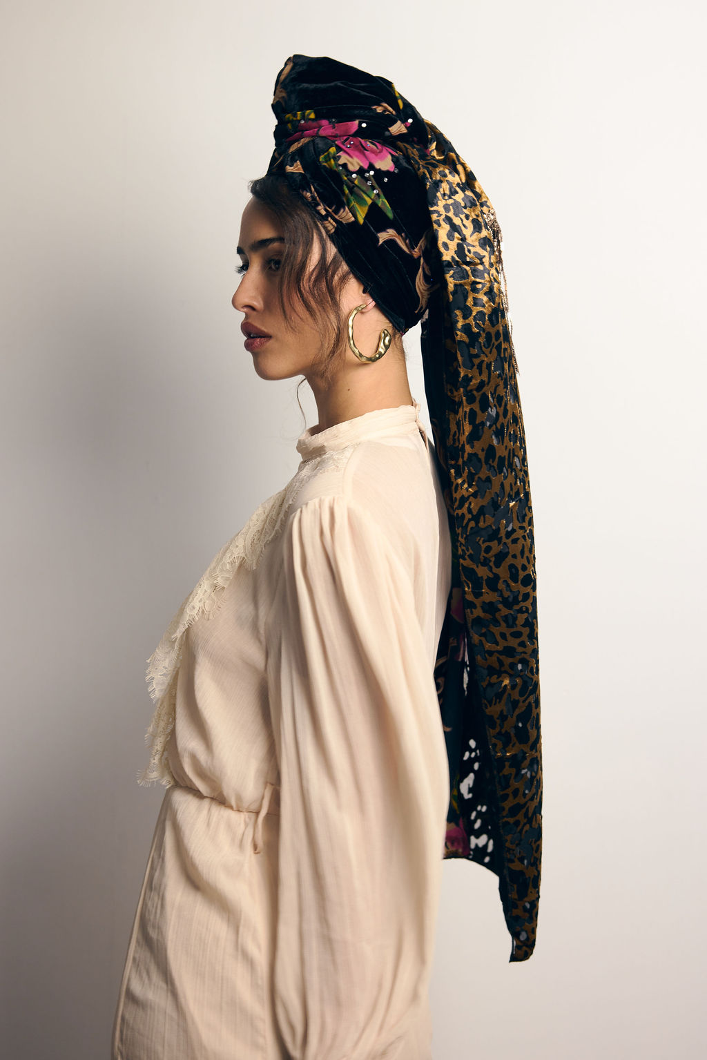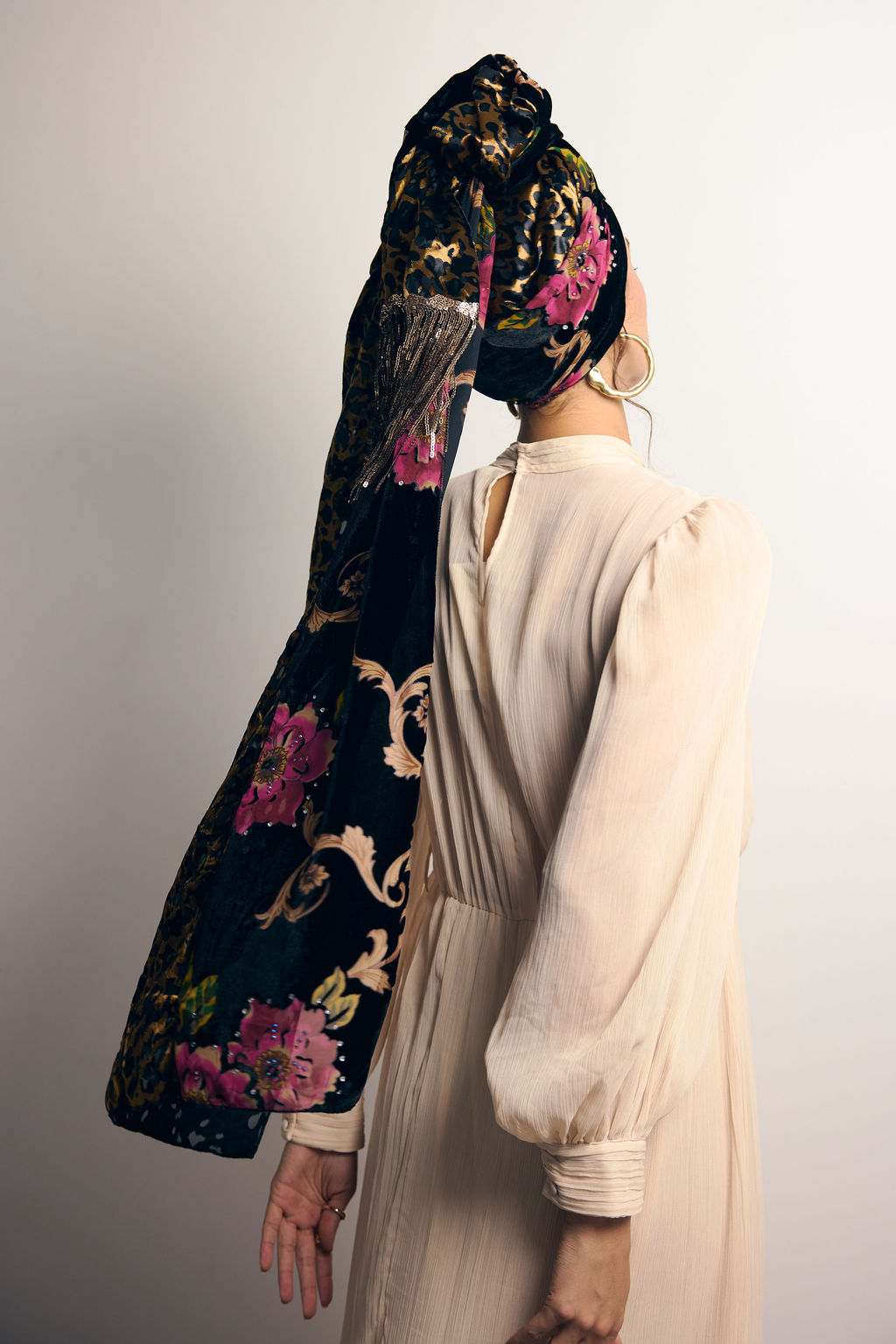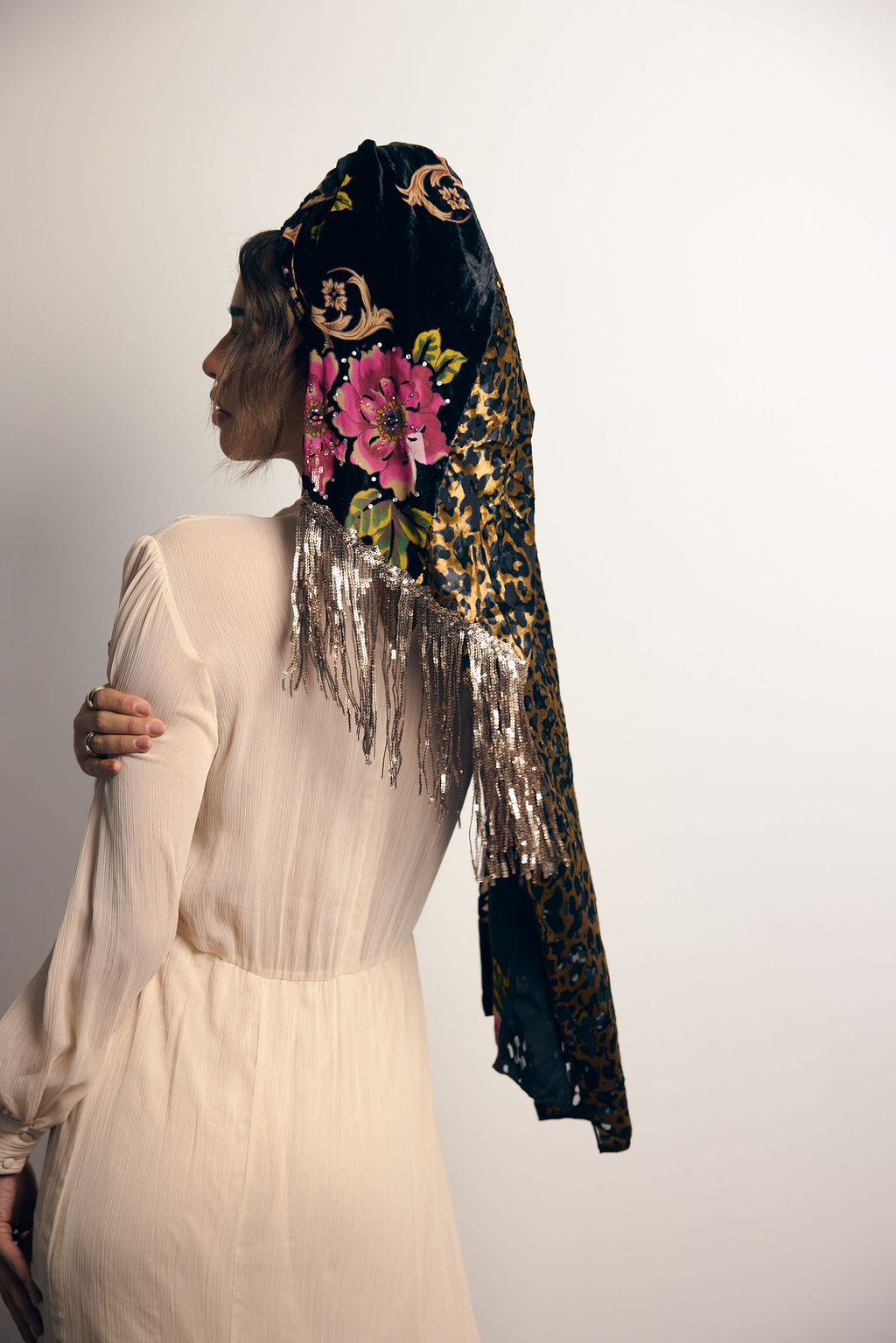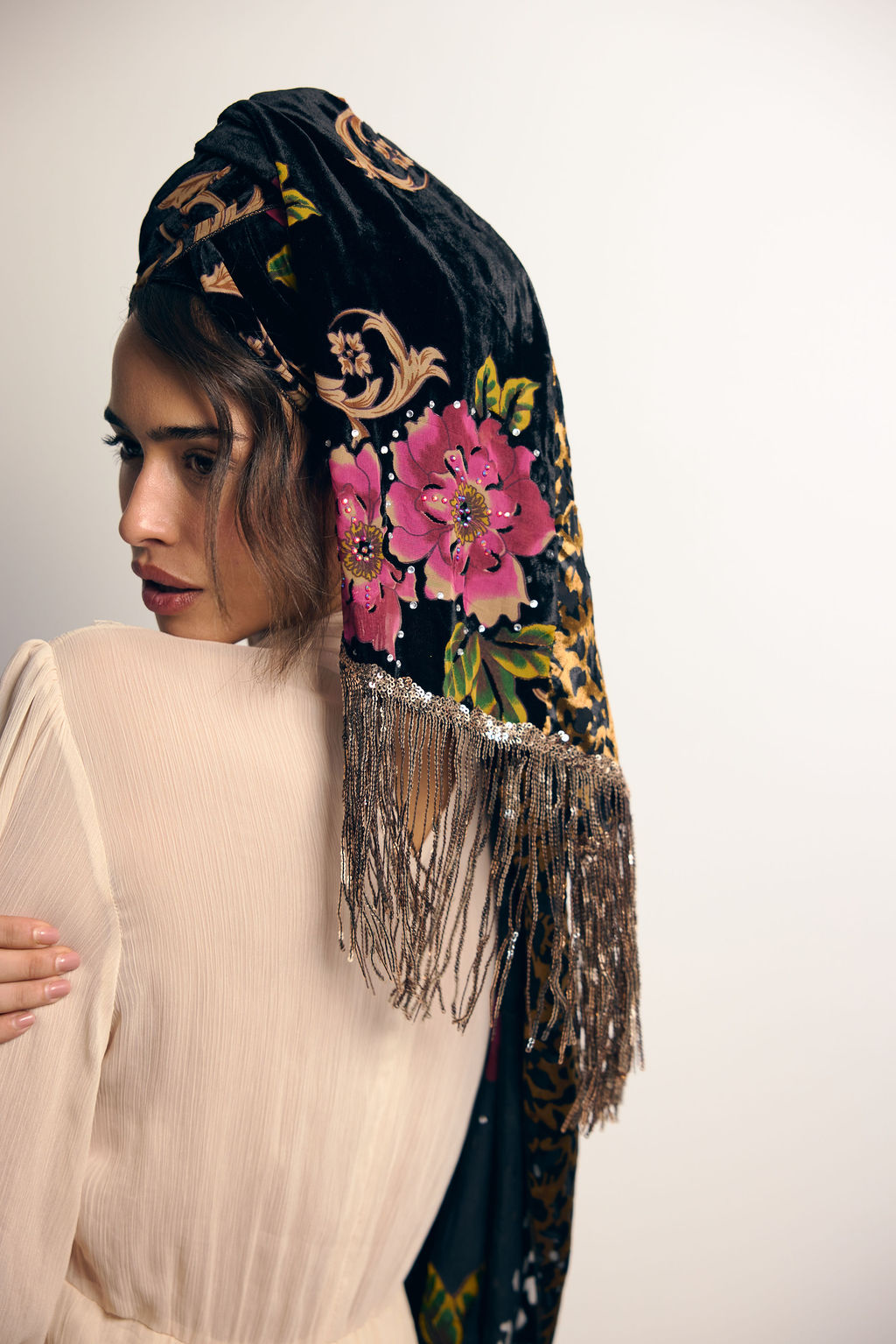 מטפחת מהפנטת ביופייה מבד קטיפה צרובה עם הדפס פרחוני עמוק, בשילוב בד קטיפה מנומר.