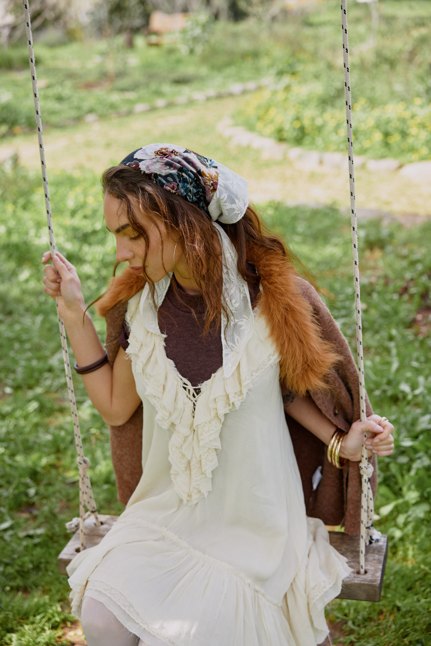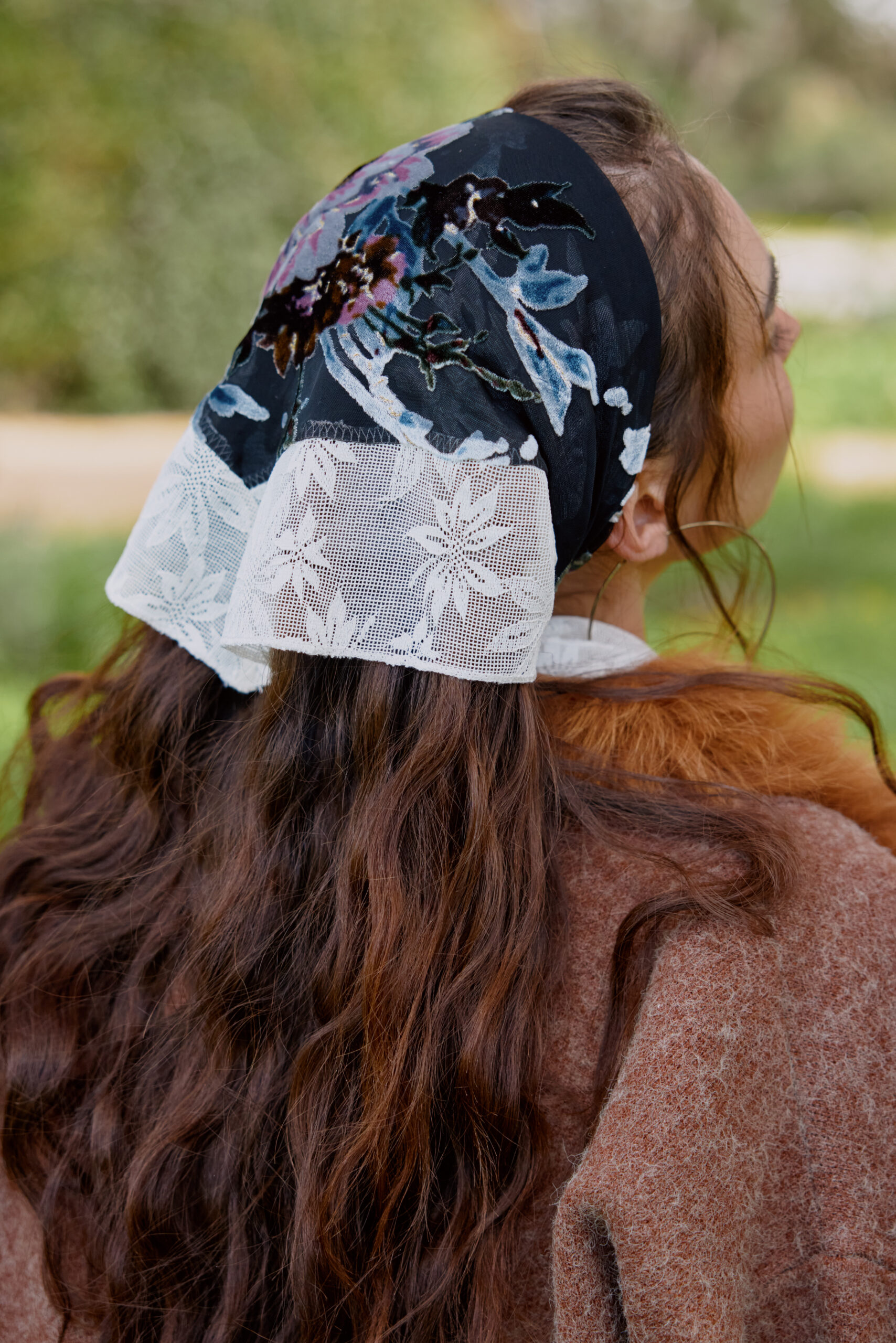בנדנה קטנה מקטיפה צרובה פרחונית בשילוב בד קרושה בוהו־רומנטי בגוון שמנת.