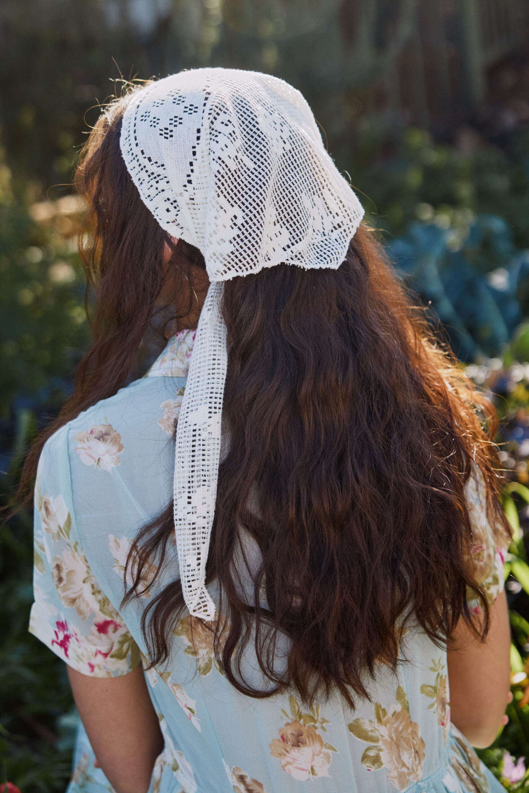 מטפחת קרושה לבנה עם טקסטורת תחרה עדינה ומלאת אופי, בהשראת רוך נוסטלגי וסטייל שמתרפק על העבר.